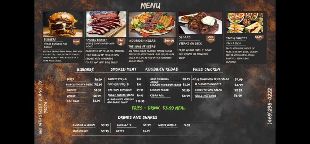 Introducing Smokin' Grill Xpress, a Halal, New American, and Barbeque joint located in Plano, TX. Known for their exceptional customer service, this restaurant offers a diverse menu ranging from burgers like the Boss Burger Beef to smoked meats like Dino Ribs and Brisket. Customers have praised the brisket, steaks, and burgers for their flavors and cooking perfection. The owner's expertise in making steaks and briskets has earned them a solid reputation in the Zabiha halal community. With a clean restaurant ambiance and friendly staff, Smokin' Grill Xpress promises a delightful dining experience. Don't miss out on their specialties like the Philly steak and Brisket sandwich, paired with their in-house sauce for a satisfying meal. Experience the unique flavors and hospitality at Smokin' Grill Xpress.